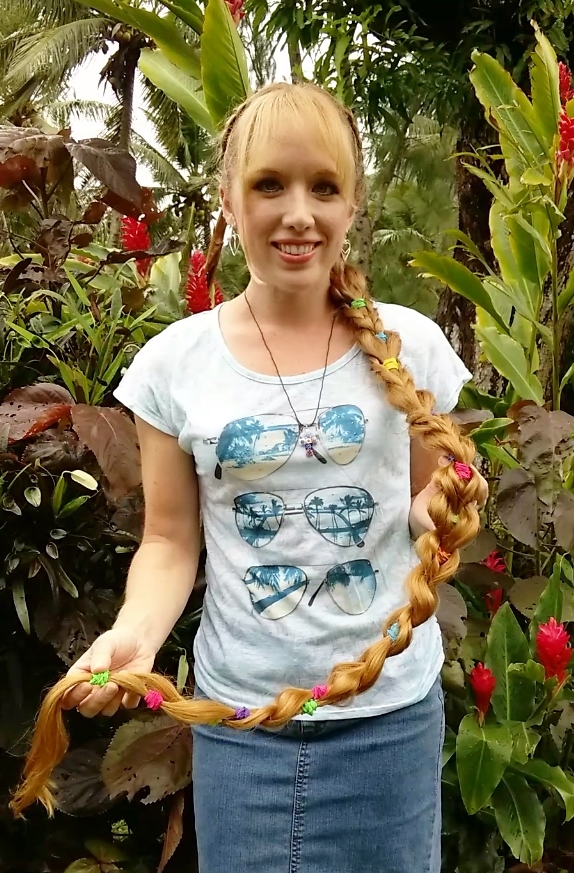 Today I fixed my hair in two Dutch braids then braided the length of my hair in a pull-through braid using rainbow-colored elastics. I love pull-through braids, they always look nice and don't get messy or fuzzy as the day goes by.